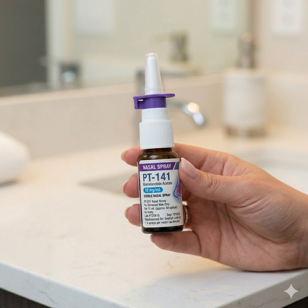 PT-141 (Bremelanotide) is a potent melanocortin receptor agonist. Unlike vascular-based treatments that merely affect blood flow, the nasal spray formulation leverages the highly vascularized nasal mucosa for rapid entry into the systemic circulation and direct signaling to the hypothalamus.