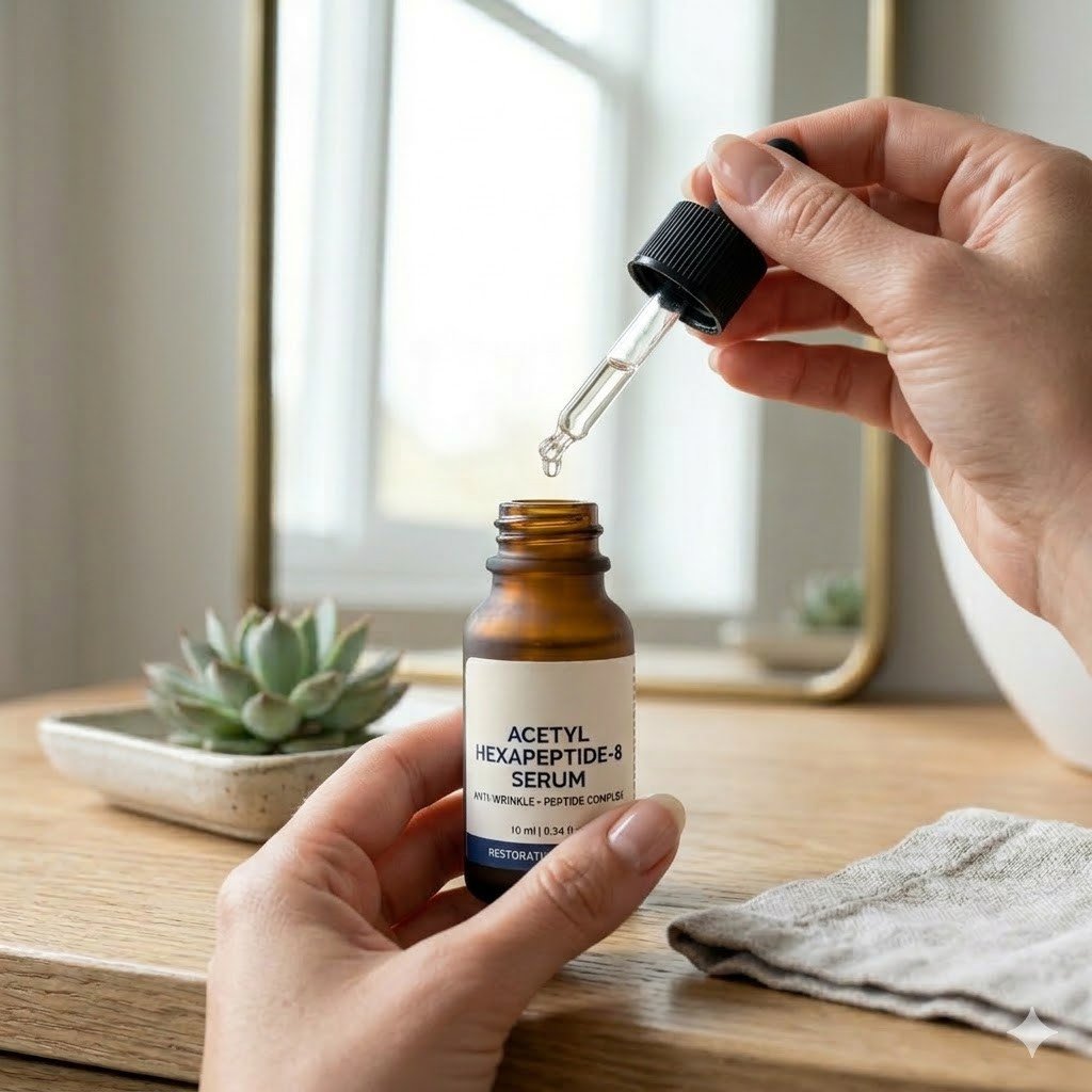 Acetyl Hexapeptide (the core of the famous Argireline® sequence) operates by subtly interrupting the chemical messages between nerves and facial muscles. By interfering with the SNARE protein complex, it prevents the skin from "over-folding," effectively acting as a biological shield against dynamic wrinkling.